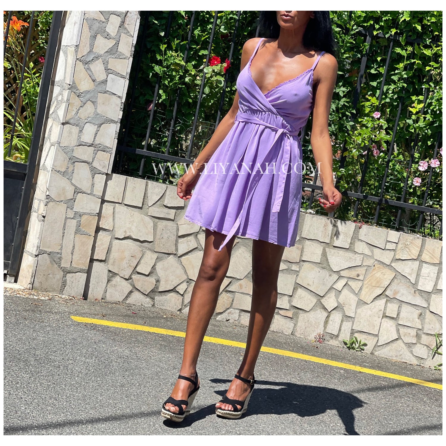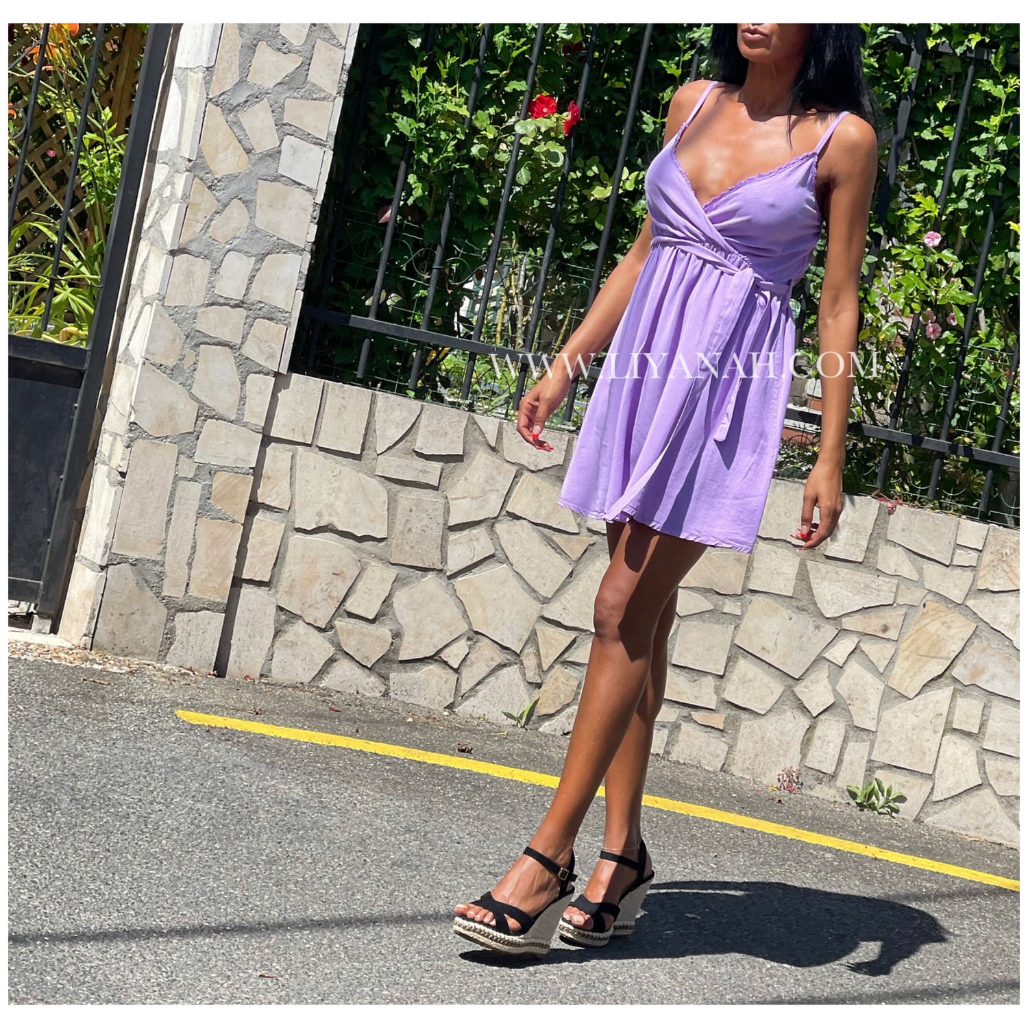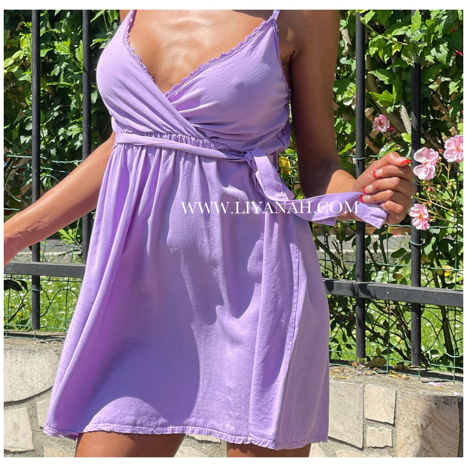 Robe courte, coupe fluide et évasée, décolleté plongeant, bretelle non réglable, ceinture a nouer - 100% Lyocell - Taille unique du 34 au 40
