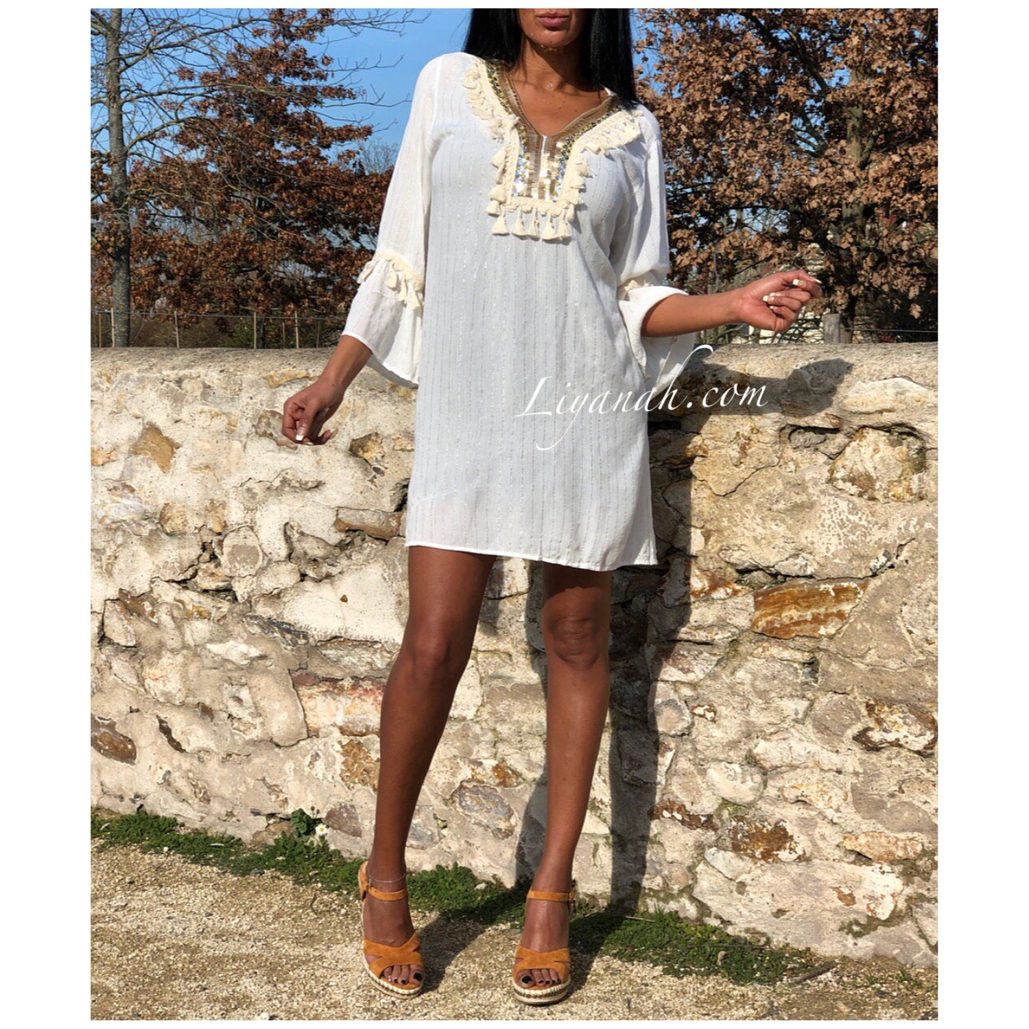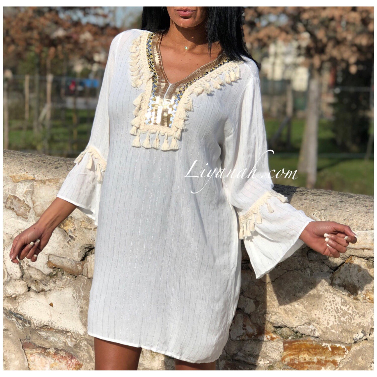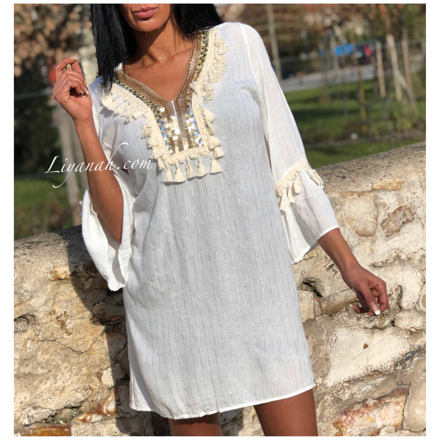 Robe Tunique Modèle NITYA ÉCRU - Une robe courte ou Tunique légèrement transparente avec détails pompons et strass - Taille SM ou ML - 65% Coton 35% Polyester - Portez là en robe avec un dessous de robe ou en Tunique avec un jean ou Short, elle fera son effet.