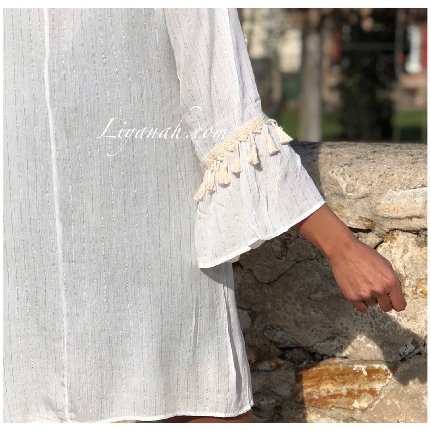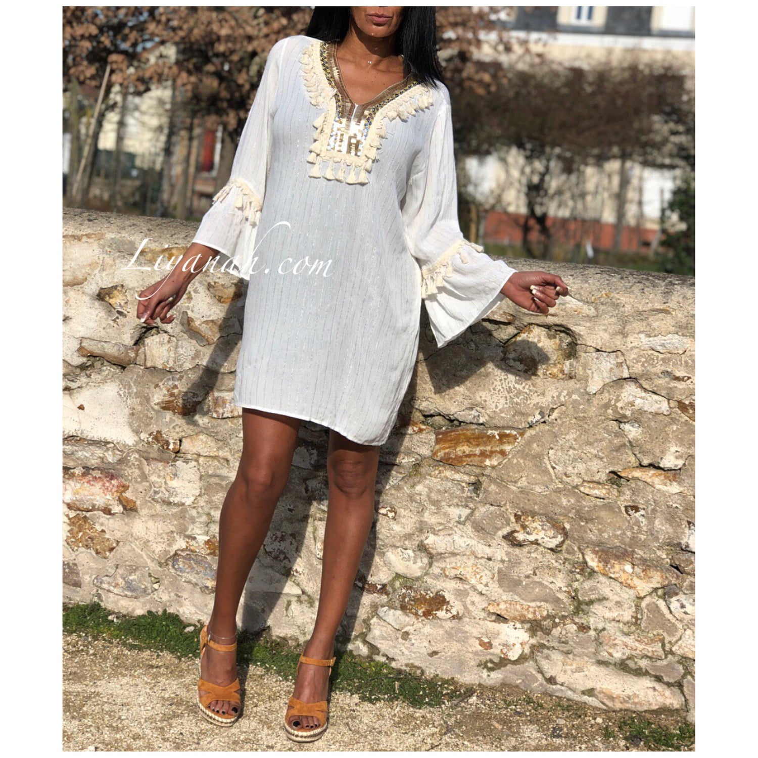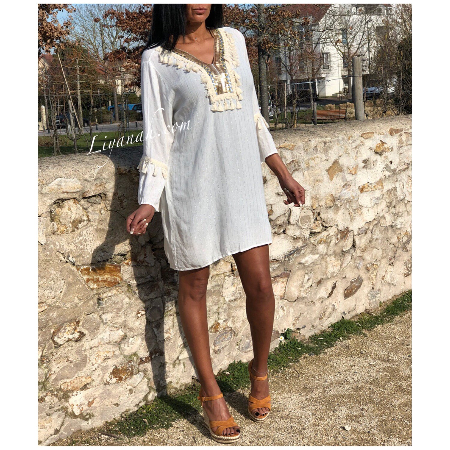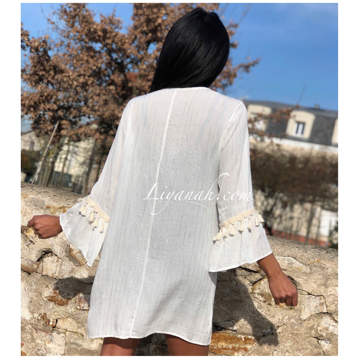 Robe Tunique Modèle NITYA ÉCRU - Une robe courte ou Tunique légèrement transparente avec détails pompons et strass - Taille SM ou ML - 65% Coton 35% Polyester - Portez là en robe avec un dessous de robe ou en Tunique avec un jean ou Short, elle fera son effet.