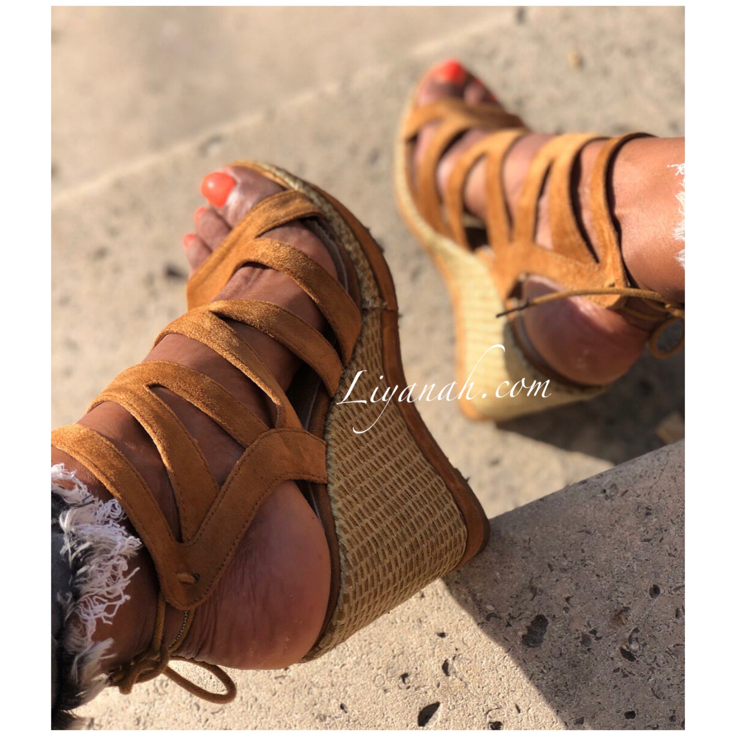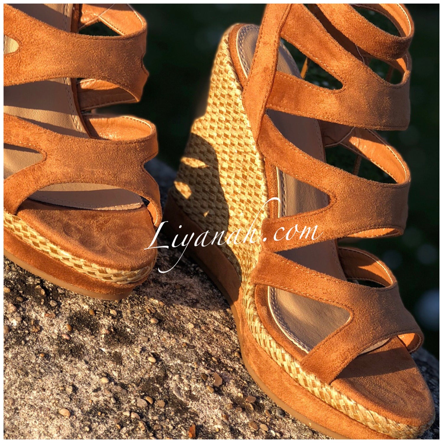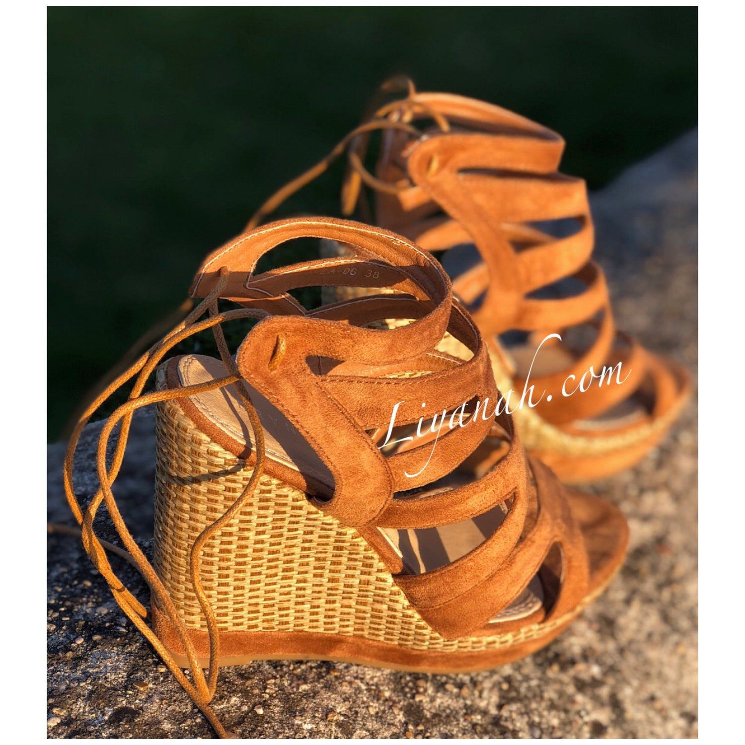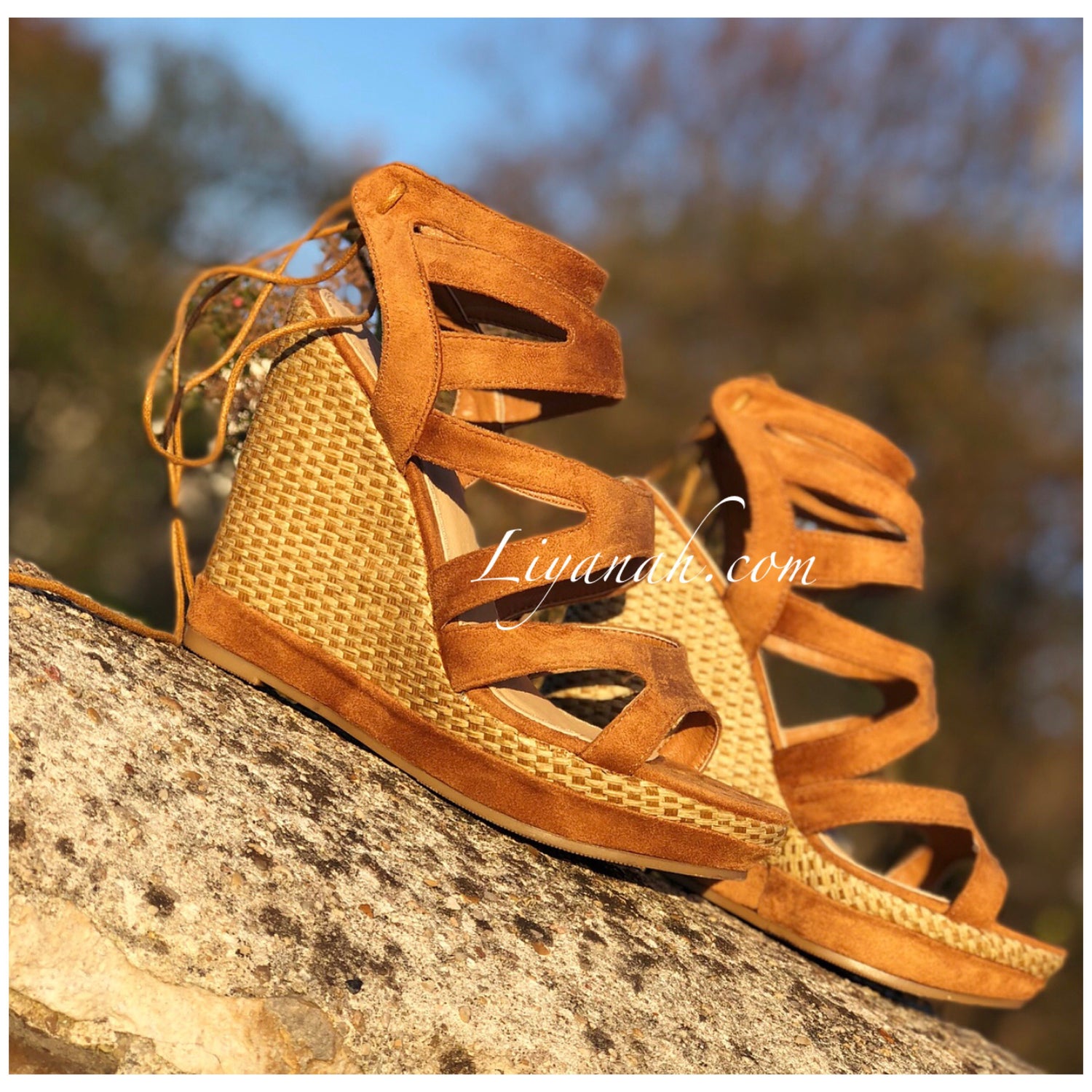 Sandales compensées à noeud à l’arrière de la cheville, aspect daim de couleur Camel sur un talon haut en corde !!! hauteur ~ 12 cm !! Un compensé pour vôtre plus grand confort. Et Pour la finition une large bande aspect daim qui s'entrelace sur le bas de la sandale - Très bon maintien du pied, et Bout ouvert !! ➰ Pointures du 36 au 41 - Conseil : Prenez votre pointure habituelle