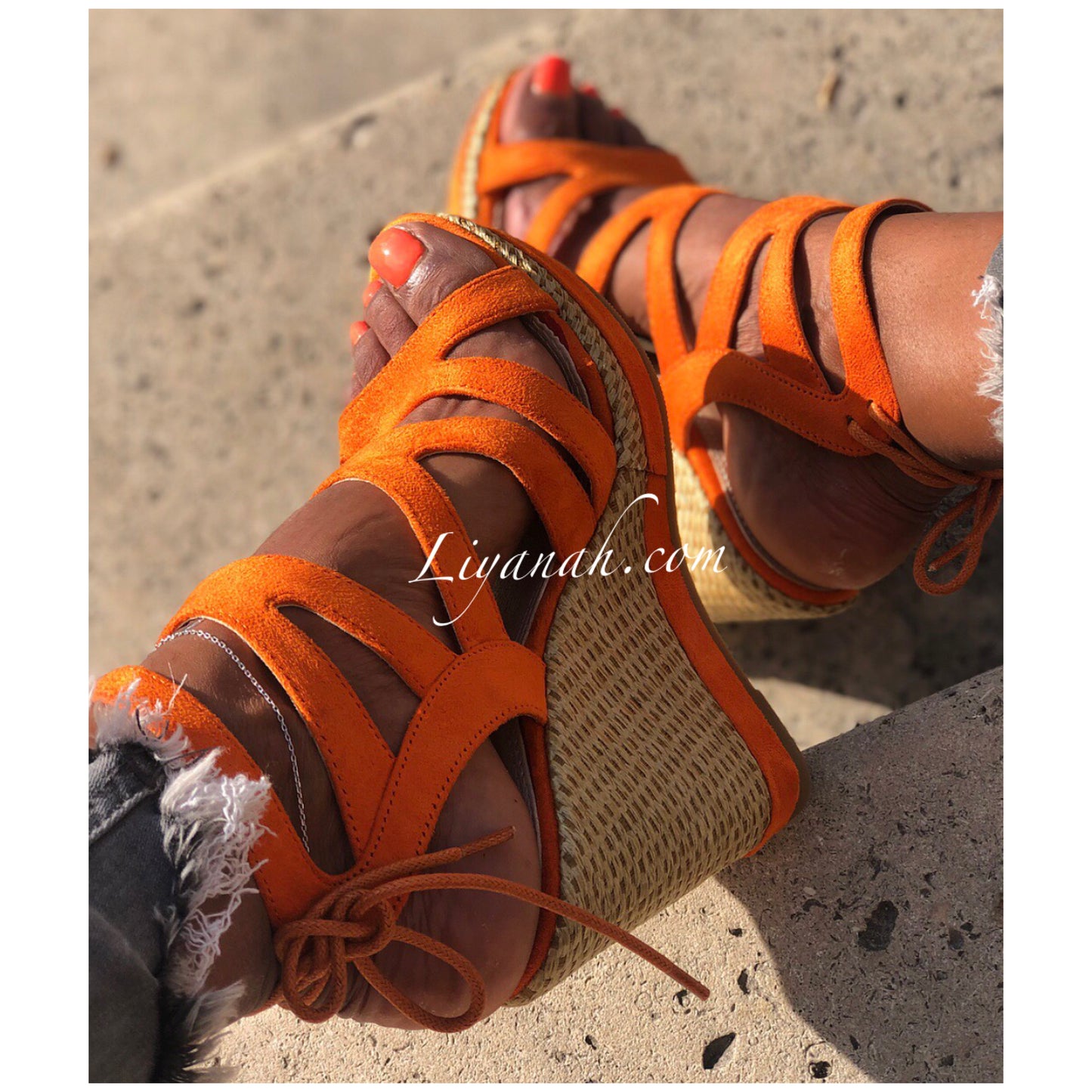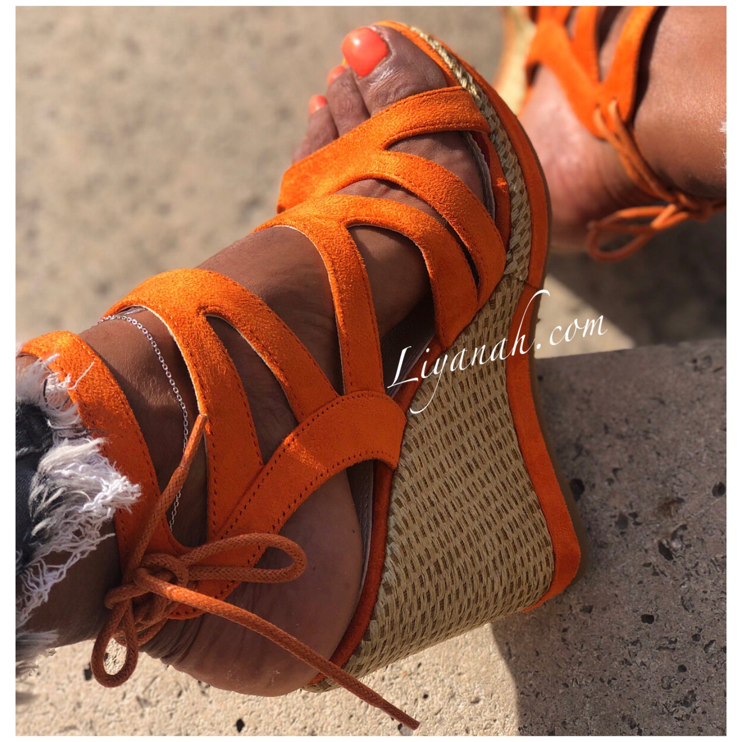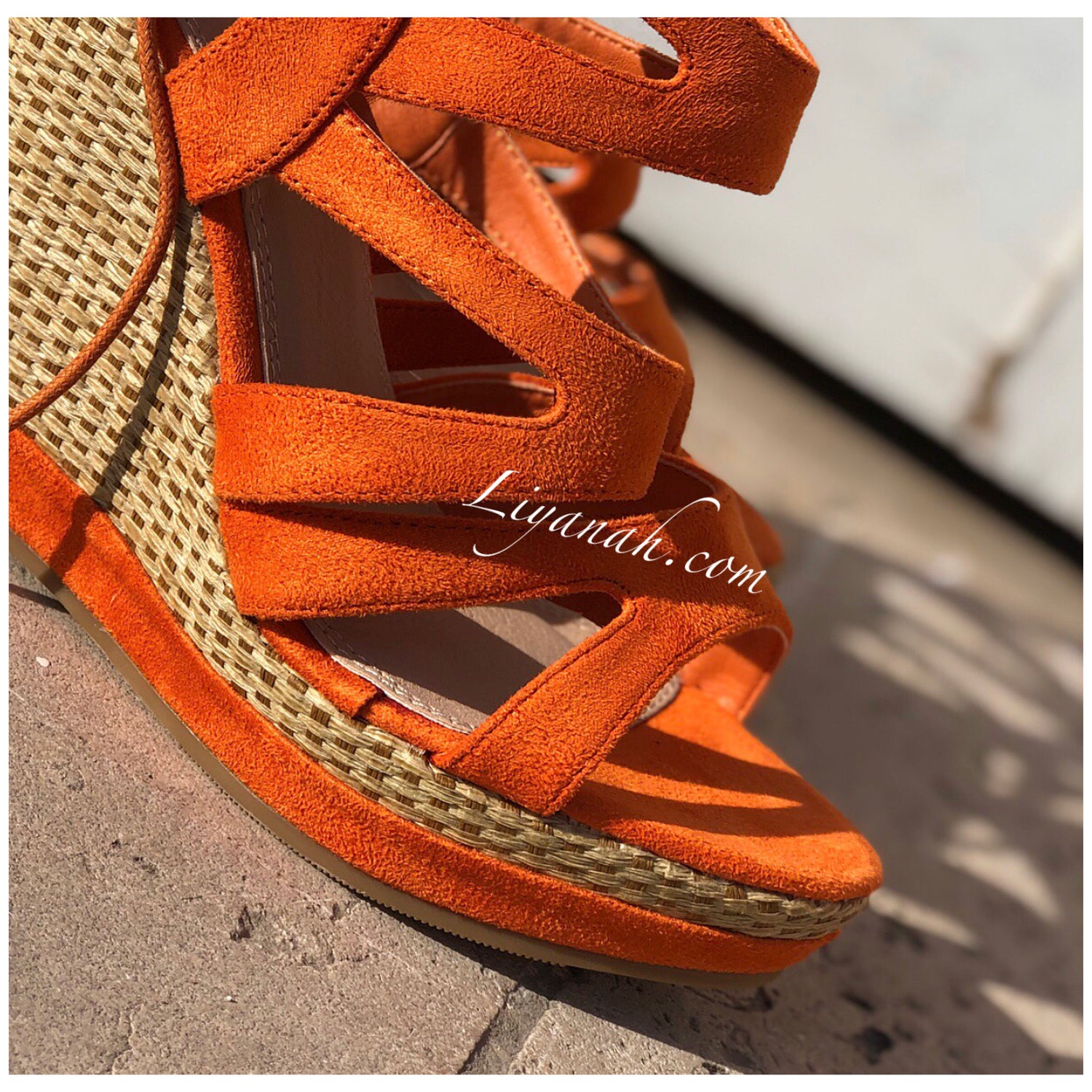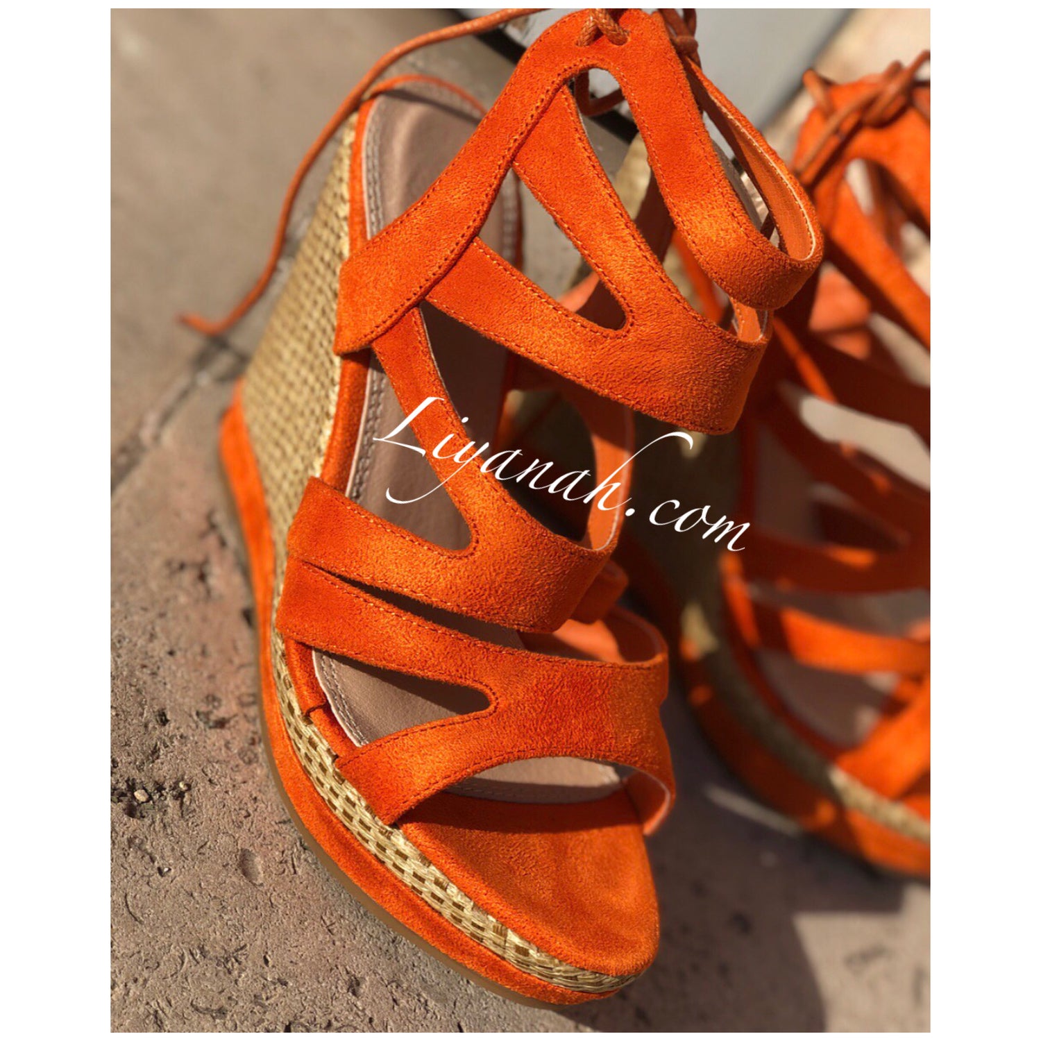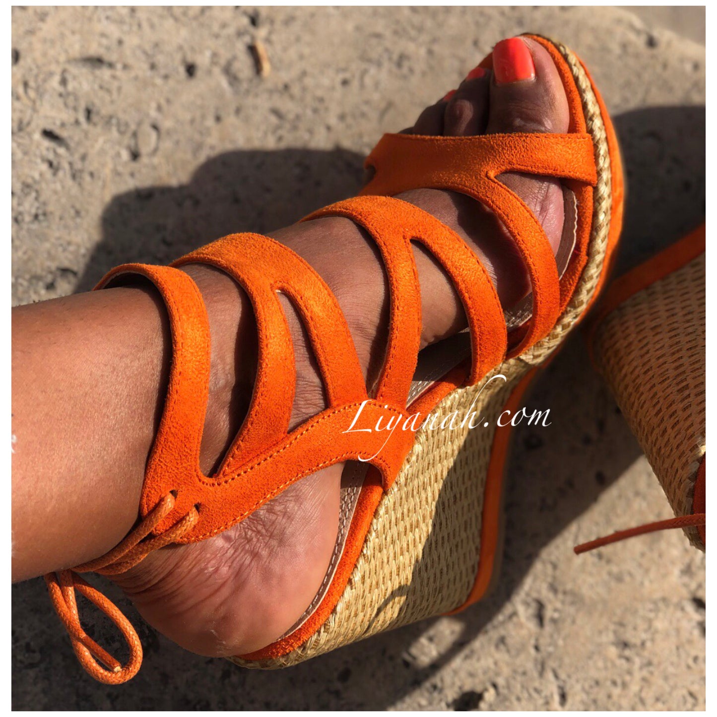SANDALES COMPENSÉES Modèle DALVA ORANGE Sandales compensées à noeud à l’arrière de la cheville, aspect daim de couleur ORANGE sur un talon haut en corde !!! hauteur ~ 12 cm !! Un compensé pour vôtre plus grand confort. Et Pour la finition une large bande aspect daim qui s'entrelace sur le bas de la sandale - Très bon maintien du pied, et Bout ouvert !! ➰ Pointures du 36 au 41 - Conseil : Prenez votre pointure habituelle Pour des raisons d'hygiène, les sandales ne sont ni repris ni échangé.