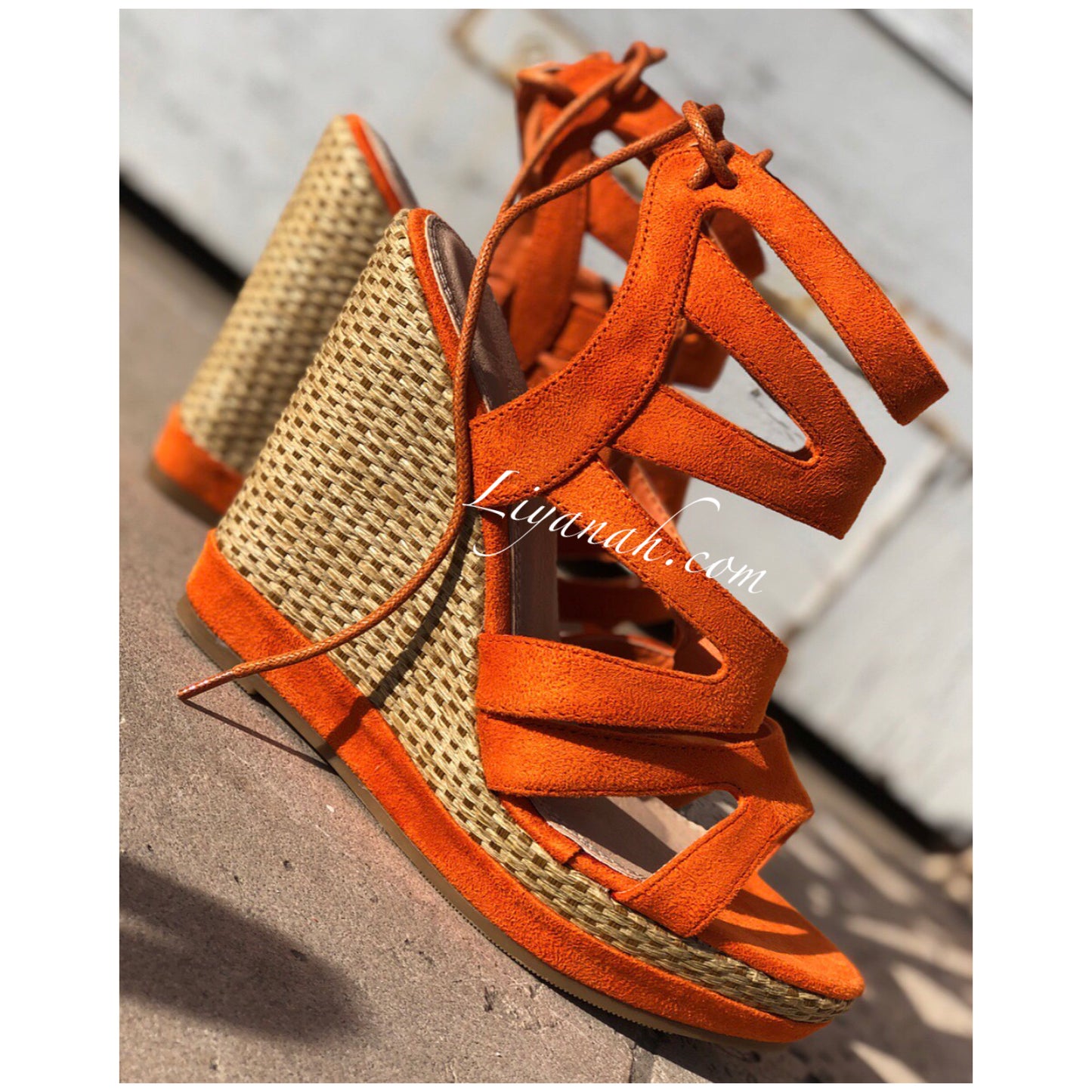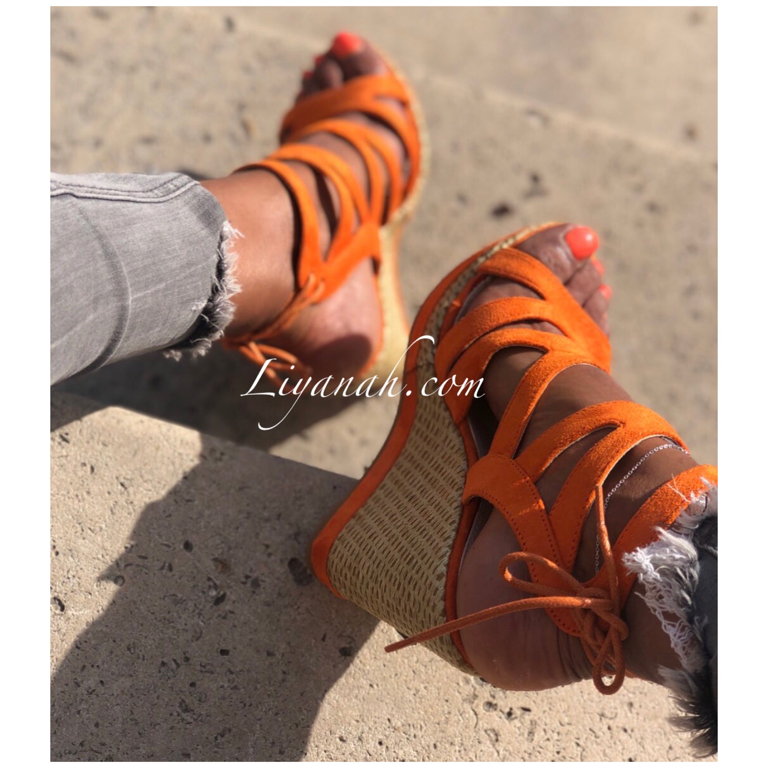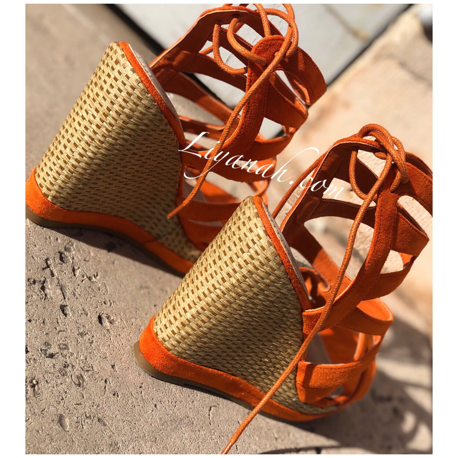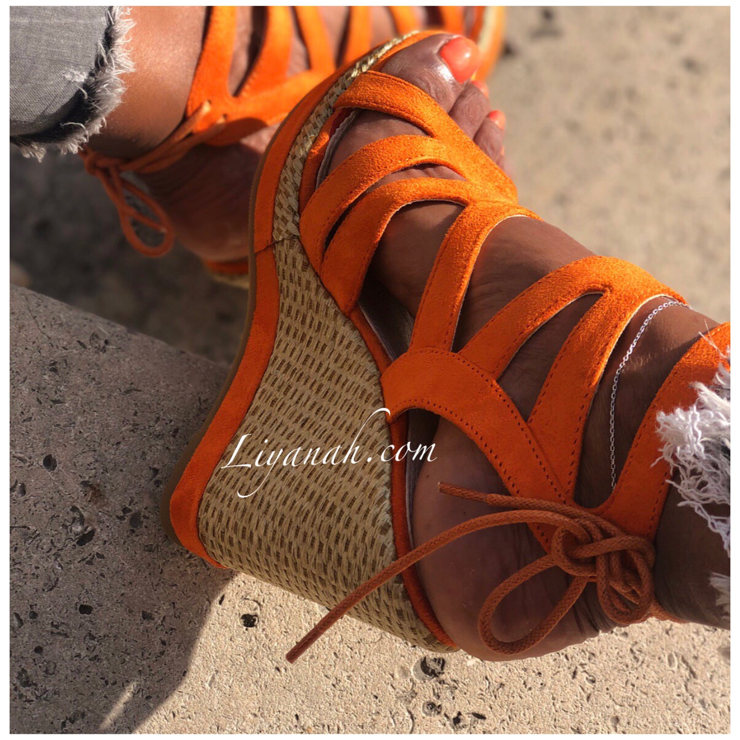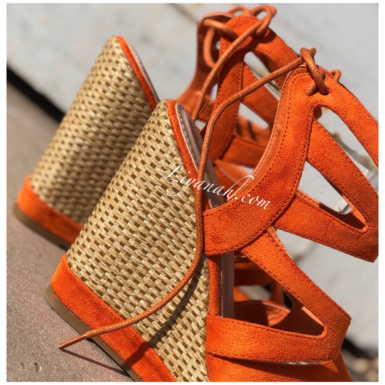 SANDALES COMPENSÉES Modèle DALVA ORANGE Sandales compensées à noeud à l’arrière de la cheville, aspect daim de couleur ORANGE sur un talon haut en corde !!! hauteur ~ 12 cm !! Un compensé pour vôtre plus grand confort. Et Pour la finition une large bande aspect daim qui s'entrelace sur le bas de la sandale - Très bon maintien du pied, et Bout ouvert !! ➰ Pointures du 36 au 41 - Conseil : Prenez votre pointure habituelle Pour des raisons d'hygiène, les sandales ne sont ni repris ni échangé.