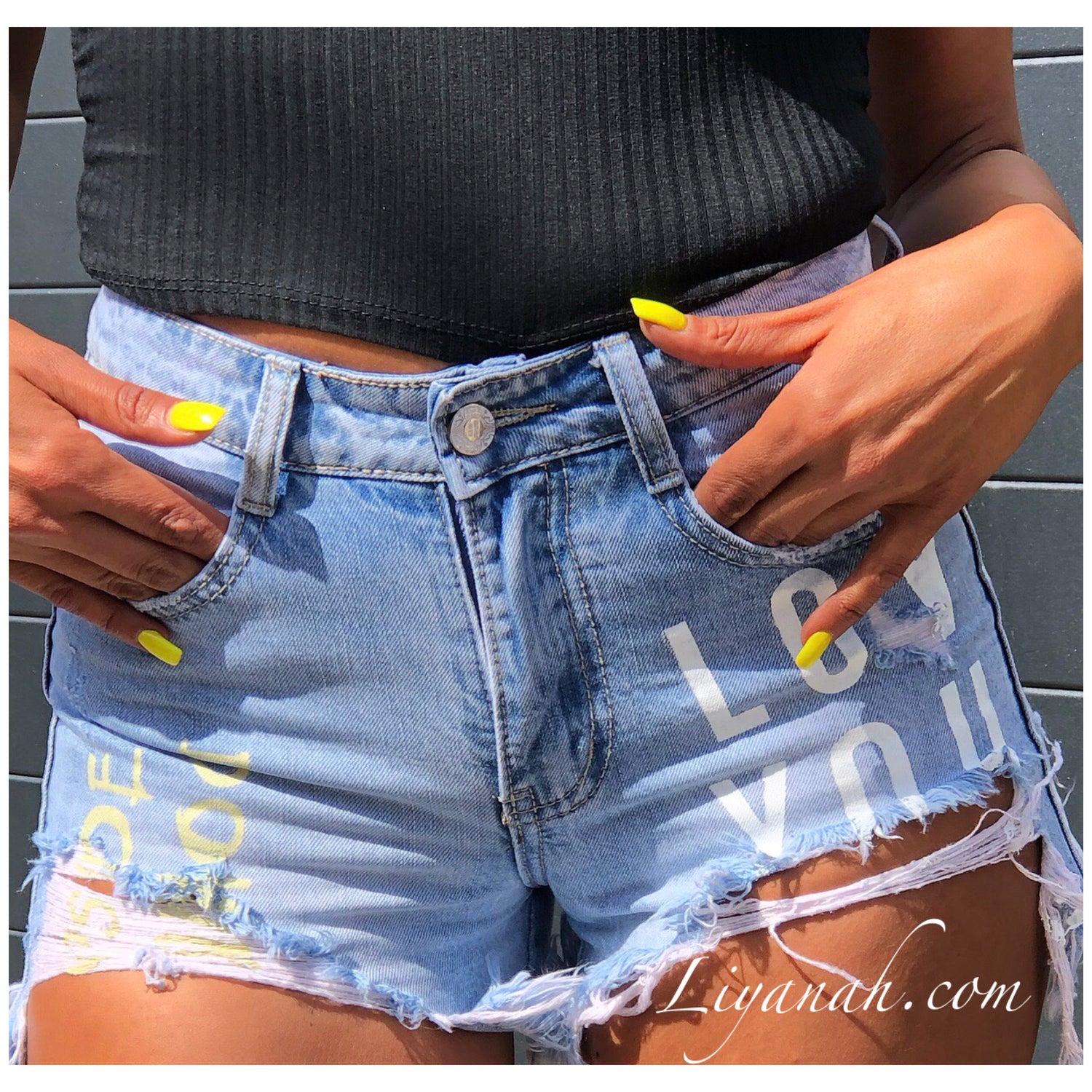 SHORT JEAN Destroy SOYA avec Écritures - Totalement en Kiff sur ce Short en jean destroy avec ses écritures !!! Totalement tendance !! Effet déchiré - Coupe TRÈS près du corps ET COURT - 95% COTTON 5% Elasthanne - Fermeture avant par ZIP et bouton - 4 poches - Taille XS AU XL (CONSEIL : PRENDRE UNE TAILLE AU DESSUS SAUF SI VOUS SOUHAITEZ LE PORTER TRÈS SERRER)