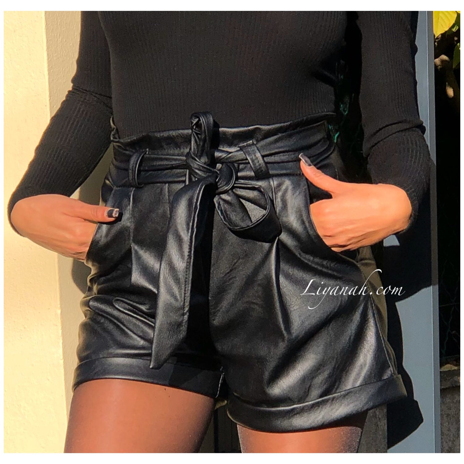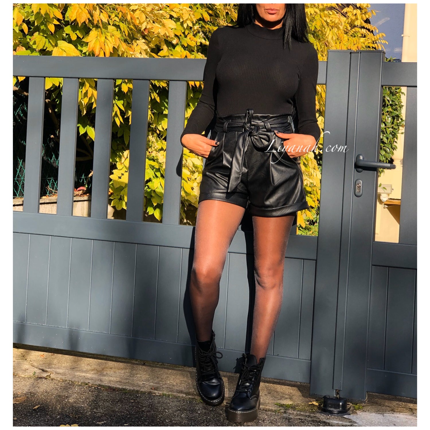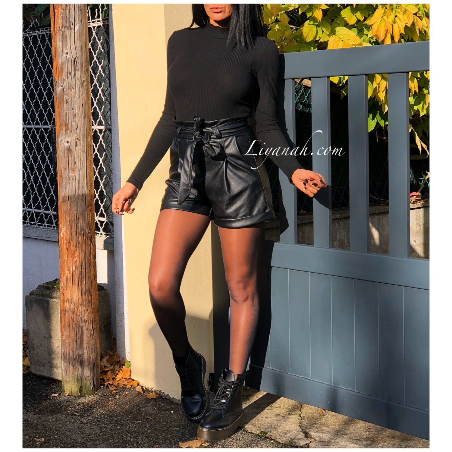 Short Modèle WARA NOIR - Short aspect cuir, court et cintré, noeud à nouer à la taille, se porte taille mi-haute avec deux poches fonctionnelles - 70% Polyester 20% Viscose 10% Elasthanne - Taille S au L - Notre modèle mesure 1m70, fait une taille 34 et porte une taille S