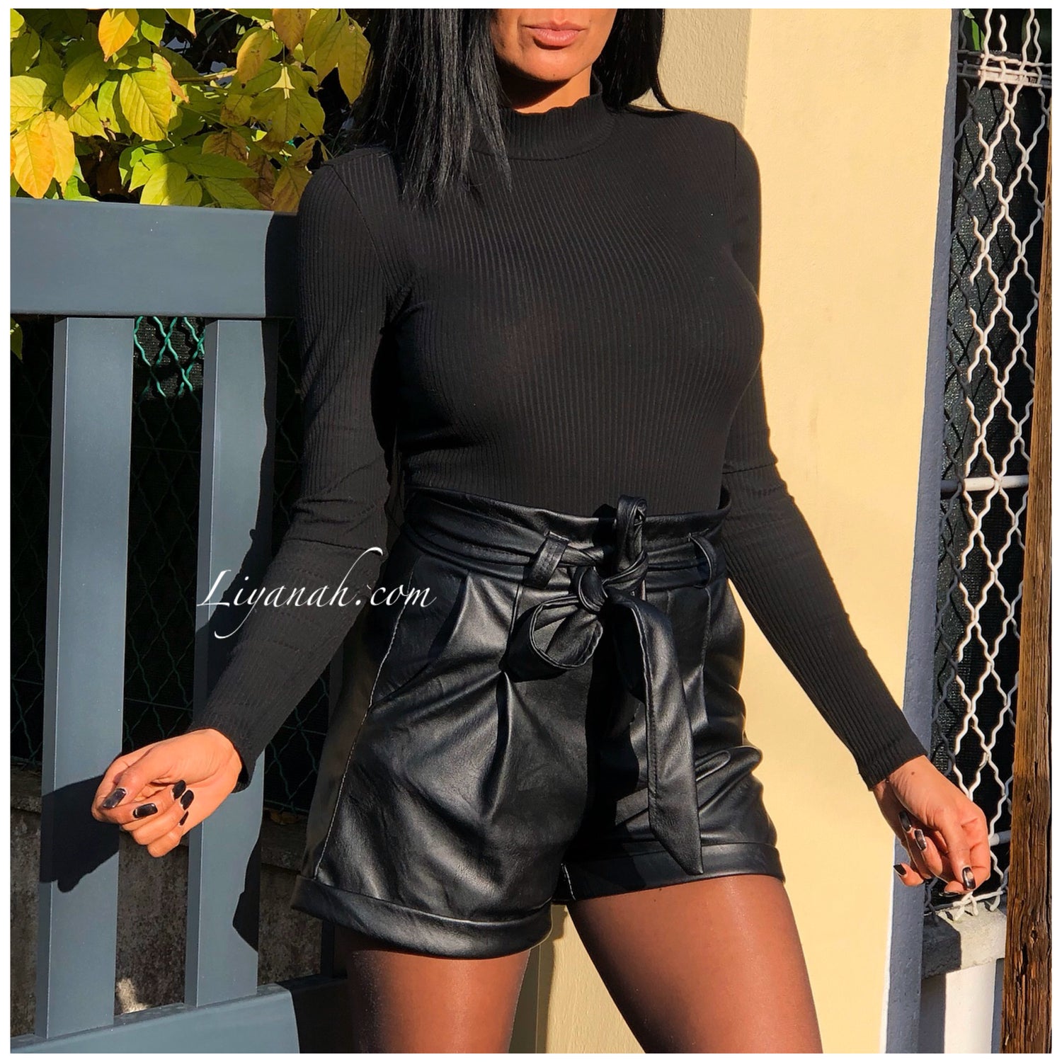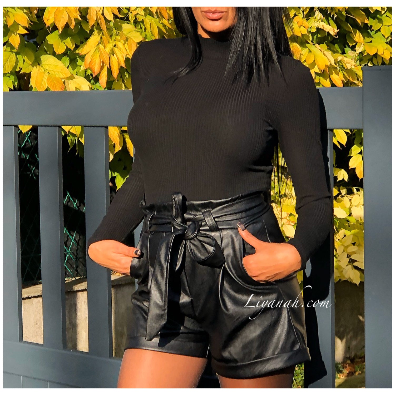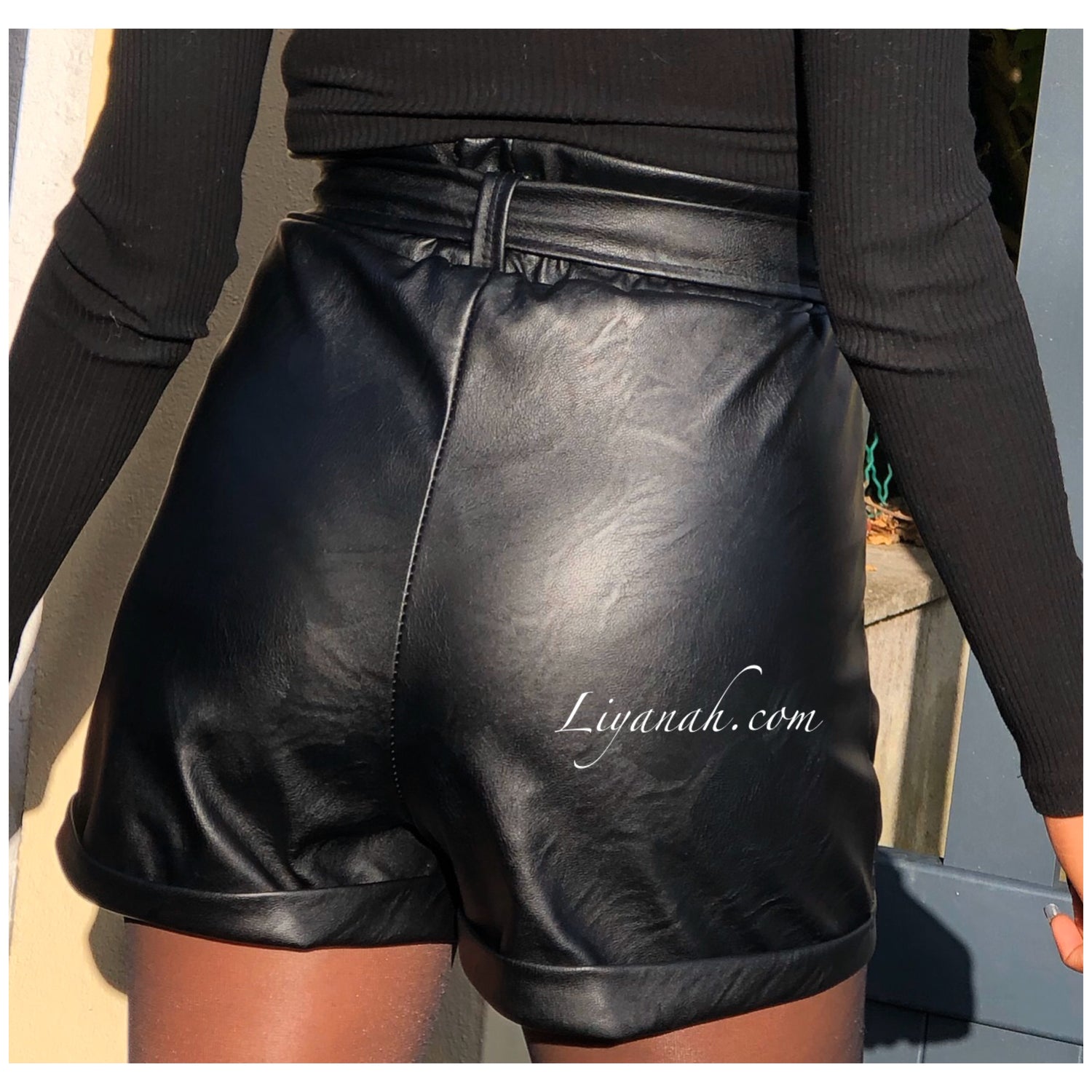 Short Modèle WARA NOIR - Short aspect cuir, court et cintré, noeud à nouer à la taille, se porte taille mi-haute avec deux poches fonctionnelles - 70% Polyester 20% Viscose 10% Elasthanne - Taille S au L - Notre modèle mesure 1m70, fait une taille 34 et porte une taille S