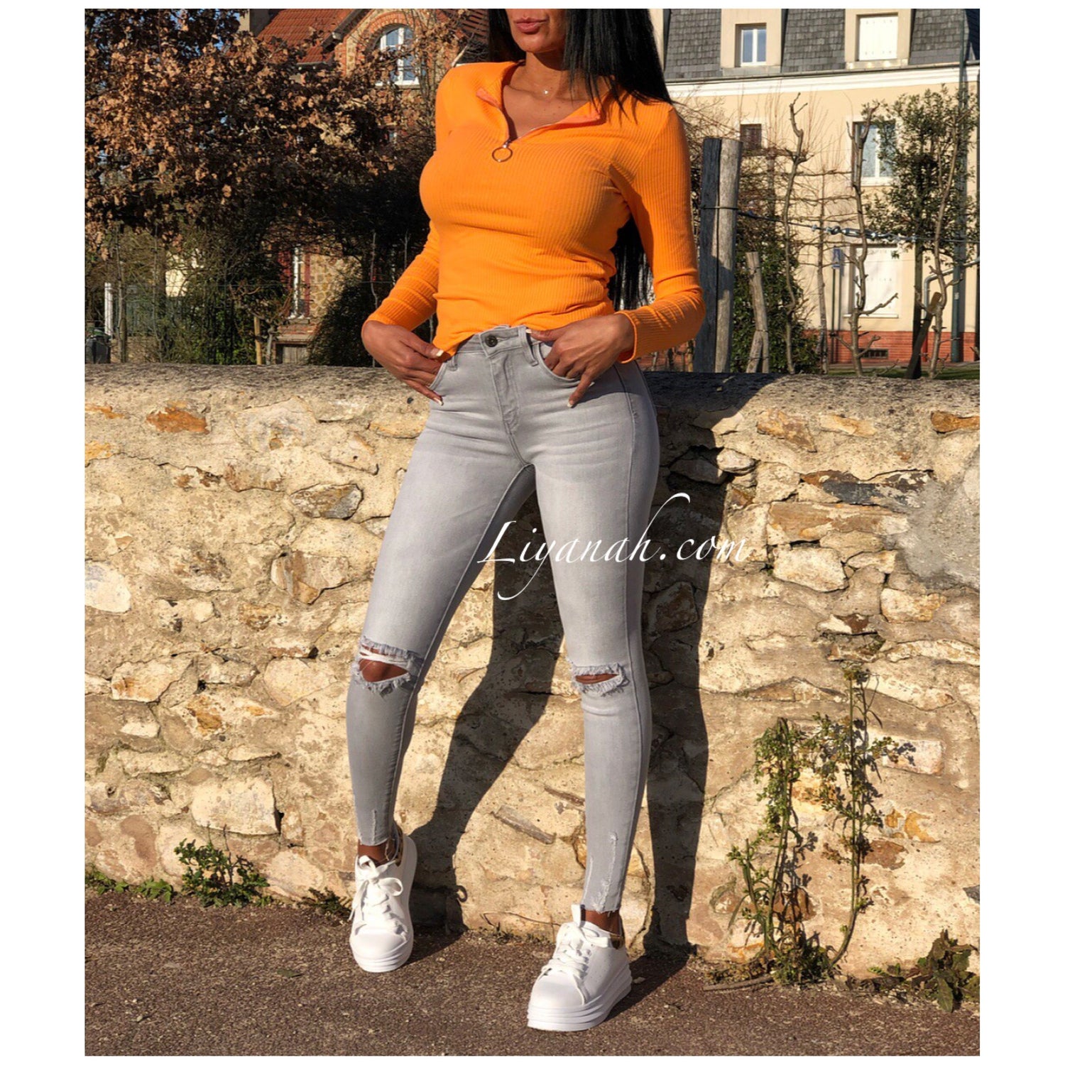 Top Modèle DOUNYA ORANGE - Top à enfiler avec Zip rond à l’avant !!! Manches longues - Coupe près du corps et matière côtelé - Taille SM ou ML - 95% Coton 5% Elasthanne