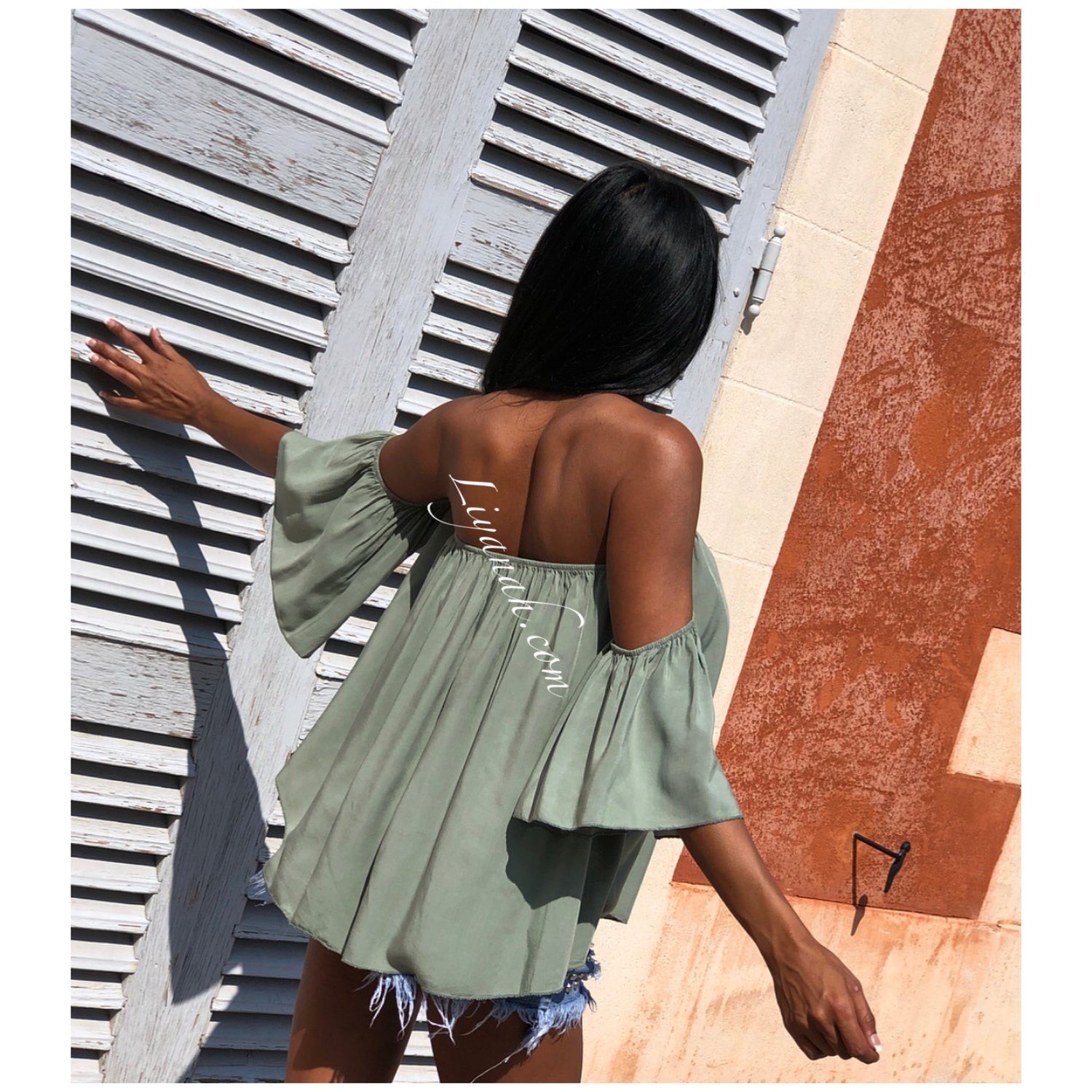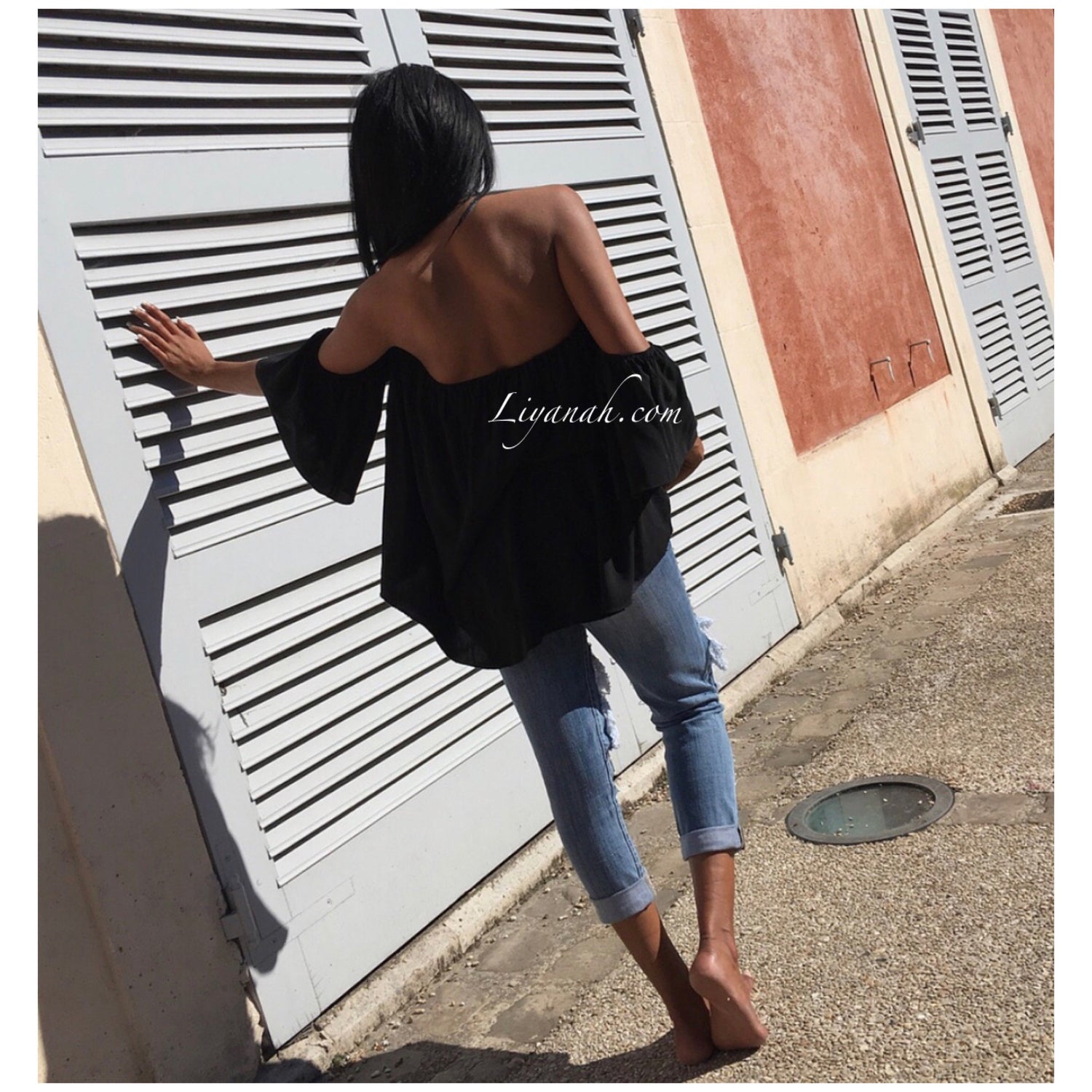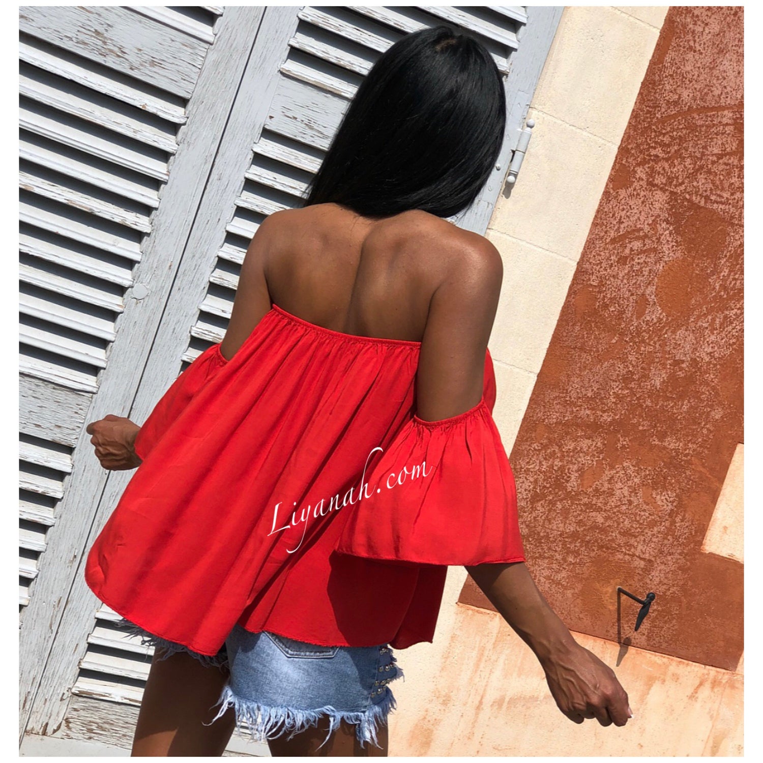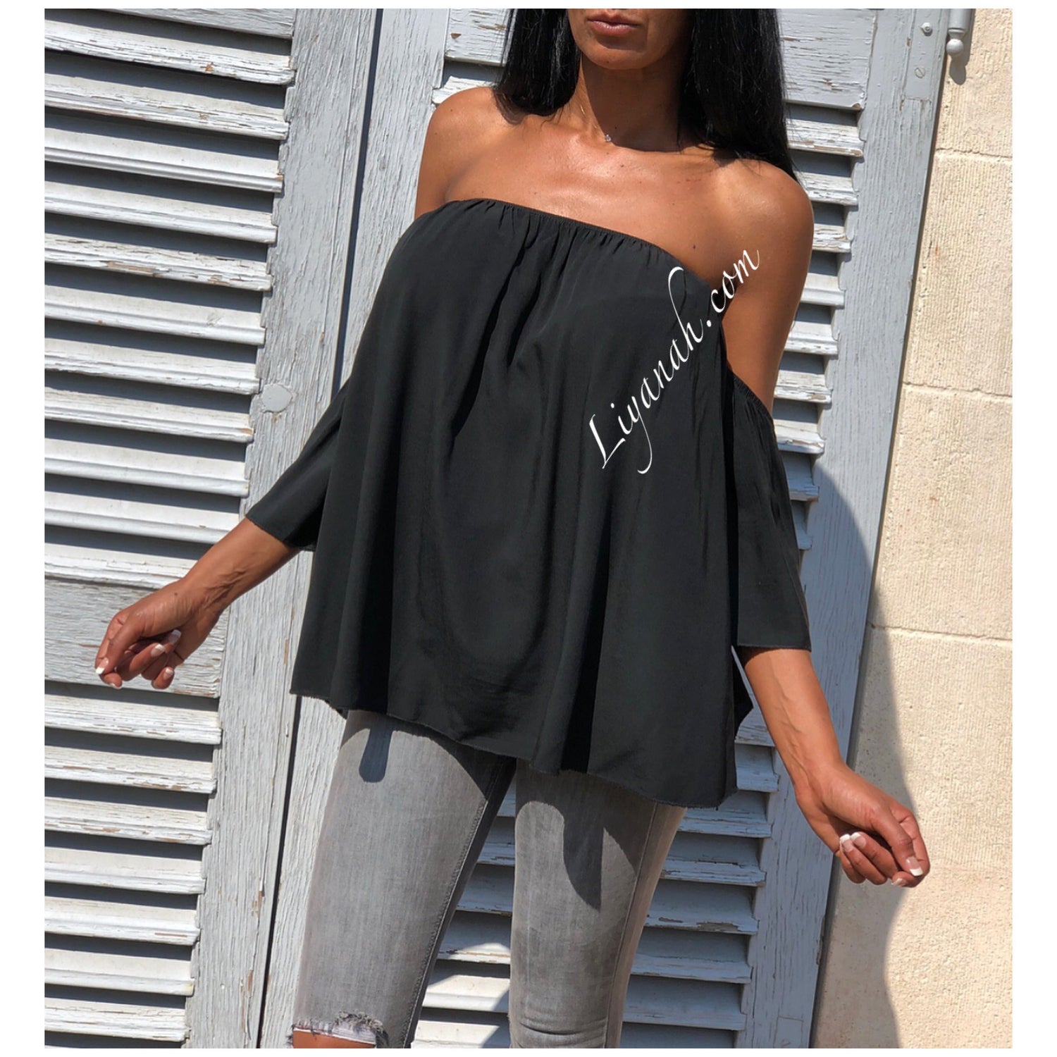 Top Modèle MELYNA Le Top MELYNA est évasé vers le bas (légèrement trapèze), col bateau elastiqué, manches évasées cousu au Top Taille Unique (Idéalement entre une taille 34 à 40) Disponible en Noir, Rose poudré, Jaune, Blanc, Rouge ou Kaki - 100% Viscose