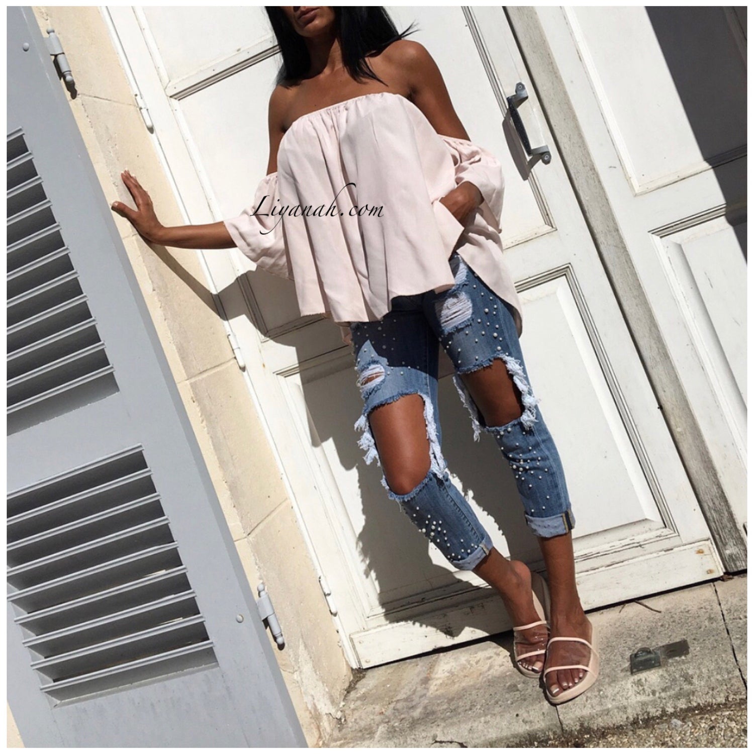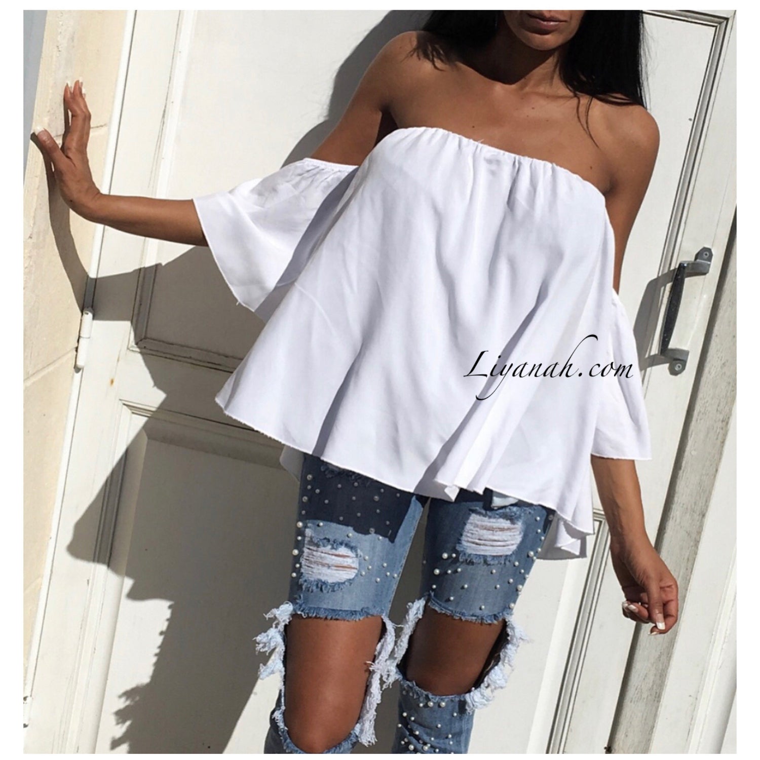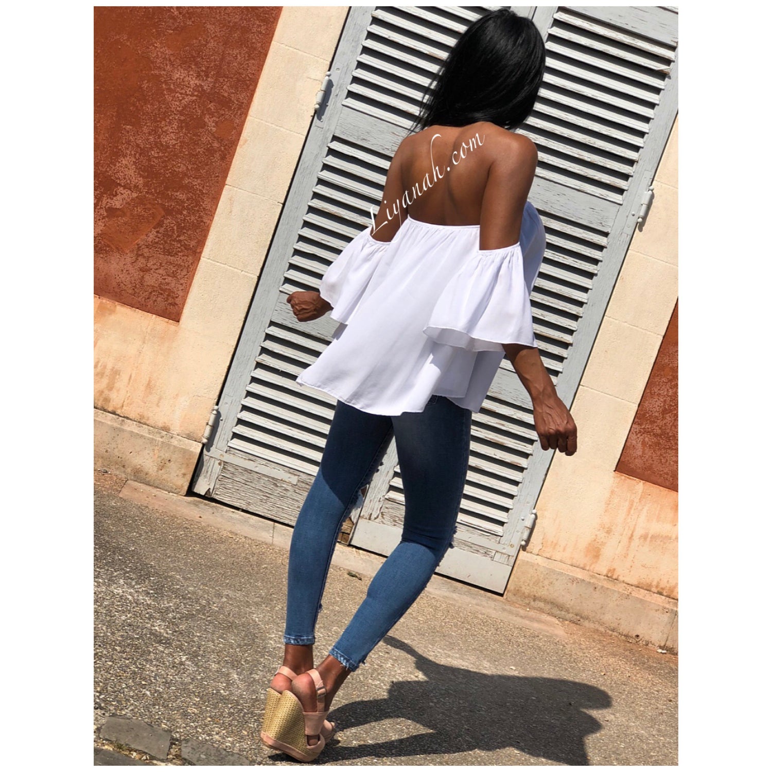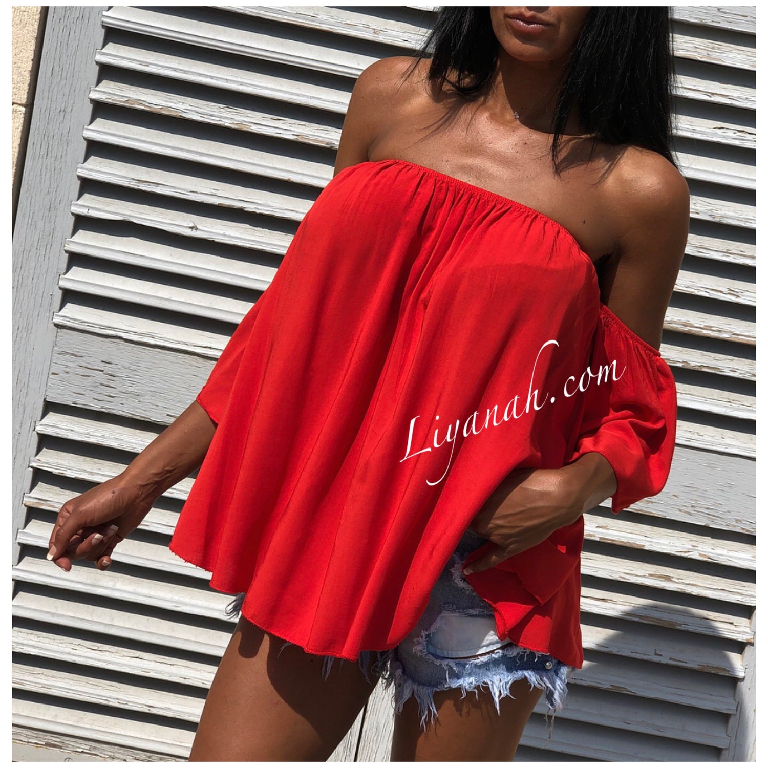 Top Modèle MELYNA Le Top MELYNA est évasé vers le bas (légèrement trapèze), col bateau elastiqué, manches évasées cousu au Top Taille Unique (Idéalement entre une taille 34 à 40) Disponible en Noir, Rose poudré, Jaune, Blanc, Rouge ou Kaki - 100% Viscose