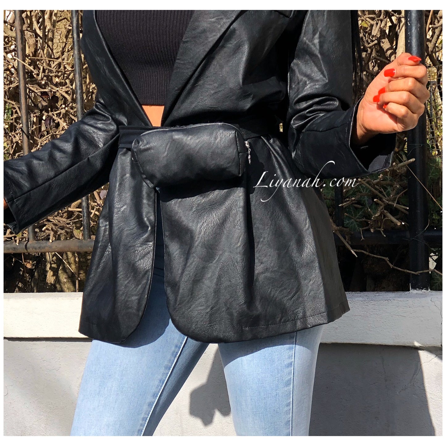 Veste Aspect Cuir Modèle SHANICE NOIR - Veste mi-Longue, fermeture bouton, avec une fausse poche poitrine, munie d’une ceinture pochette - Longueur : 77 cm - 97% Polyester 3% Elasthanne - Taille Unique du 34 au 40