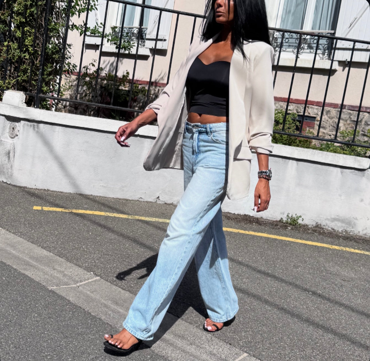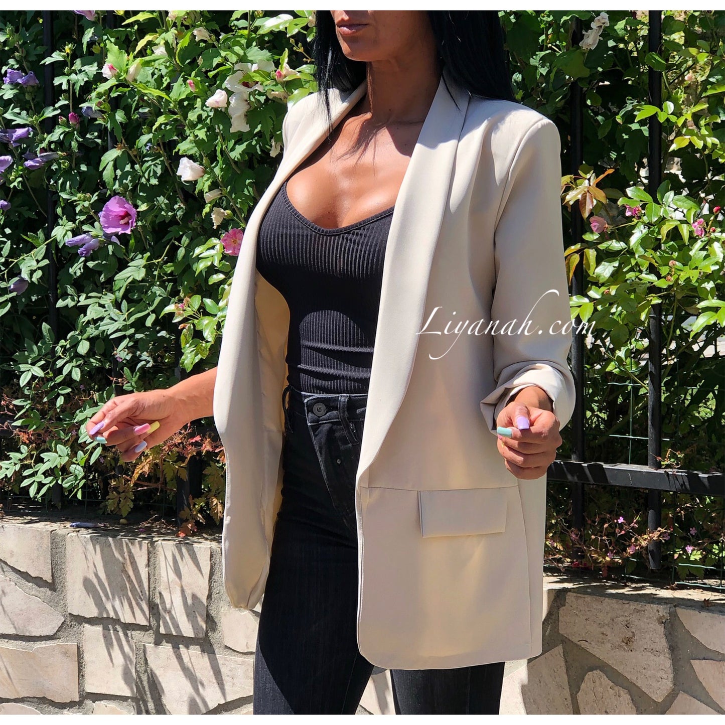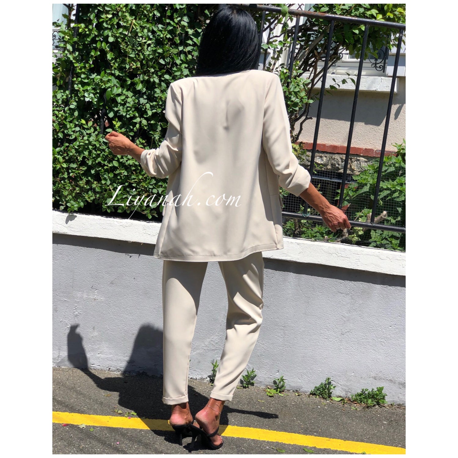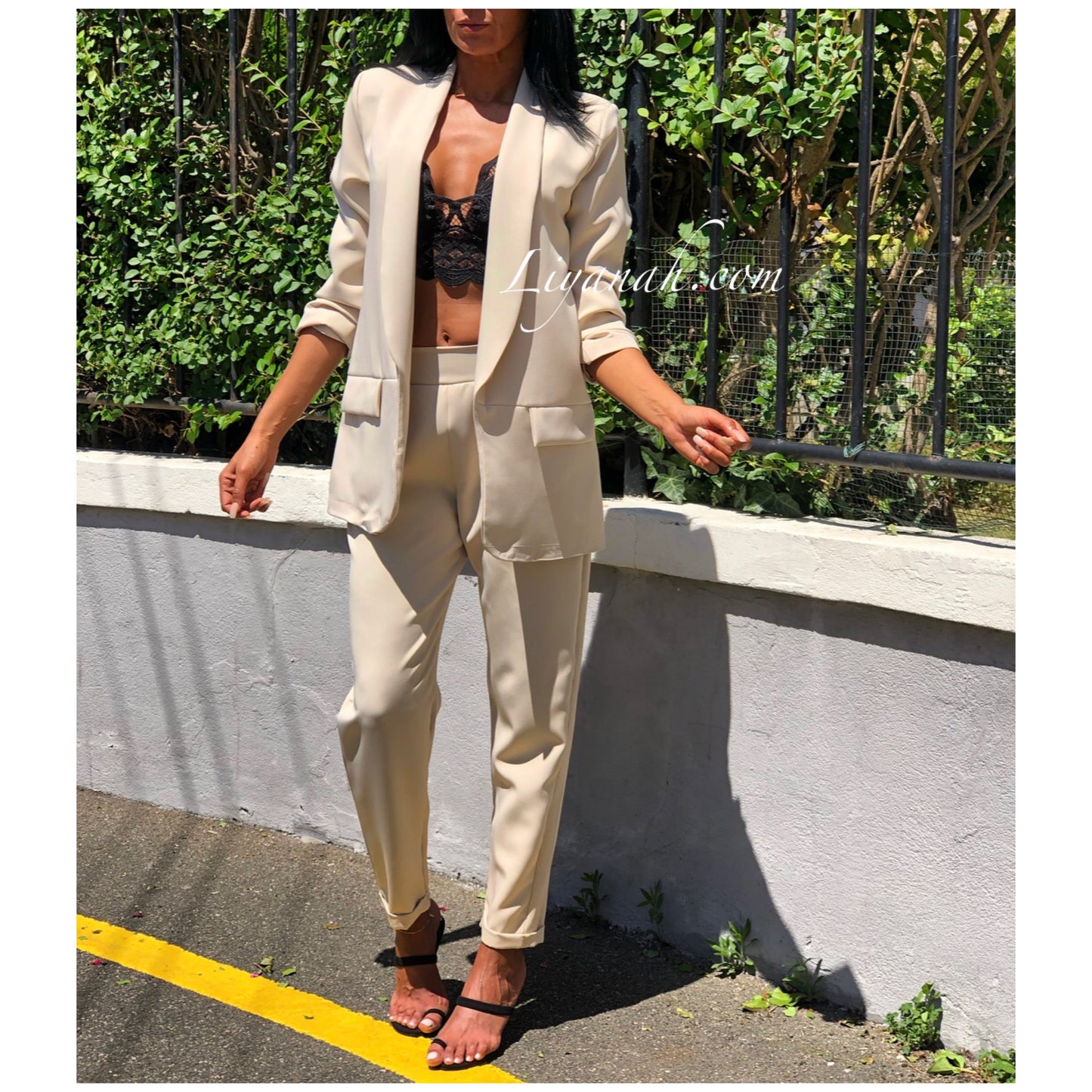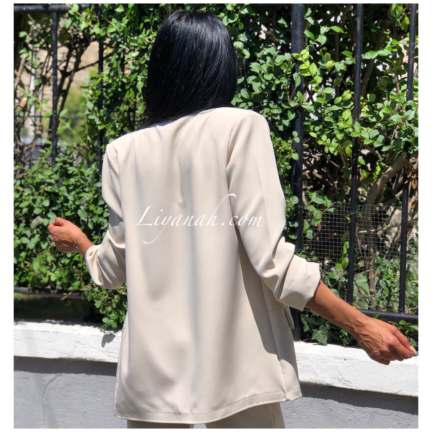 Veste tailleur, modèle léger et fluide, doublure intérieur, épaulettes, manches 3/4 fixes froncées , deux fausses poches - 95% Polyester 5% Elasthanne - Taille Unique du 34 au 40 - Longueur : 74 cm