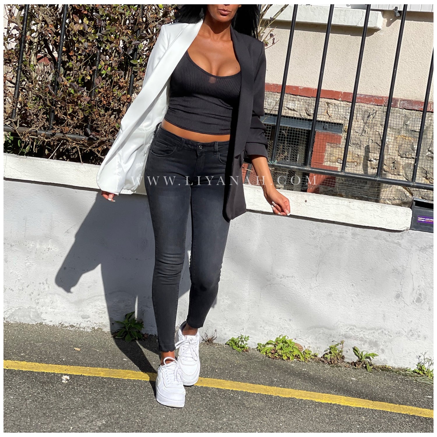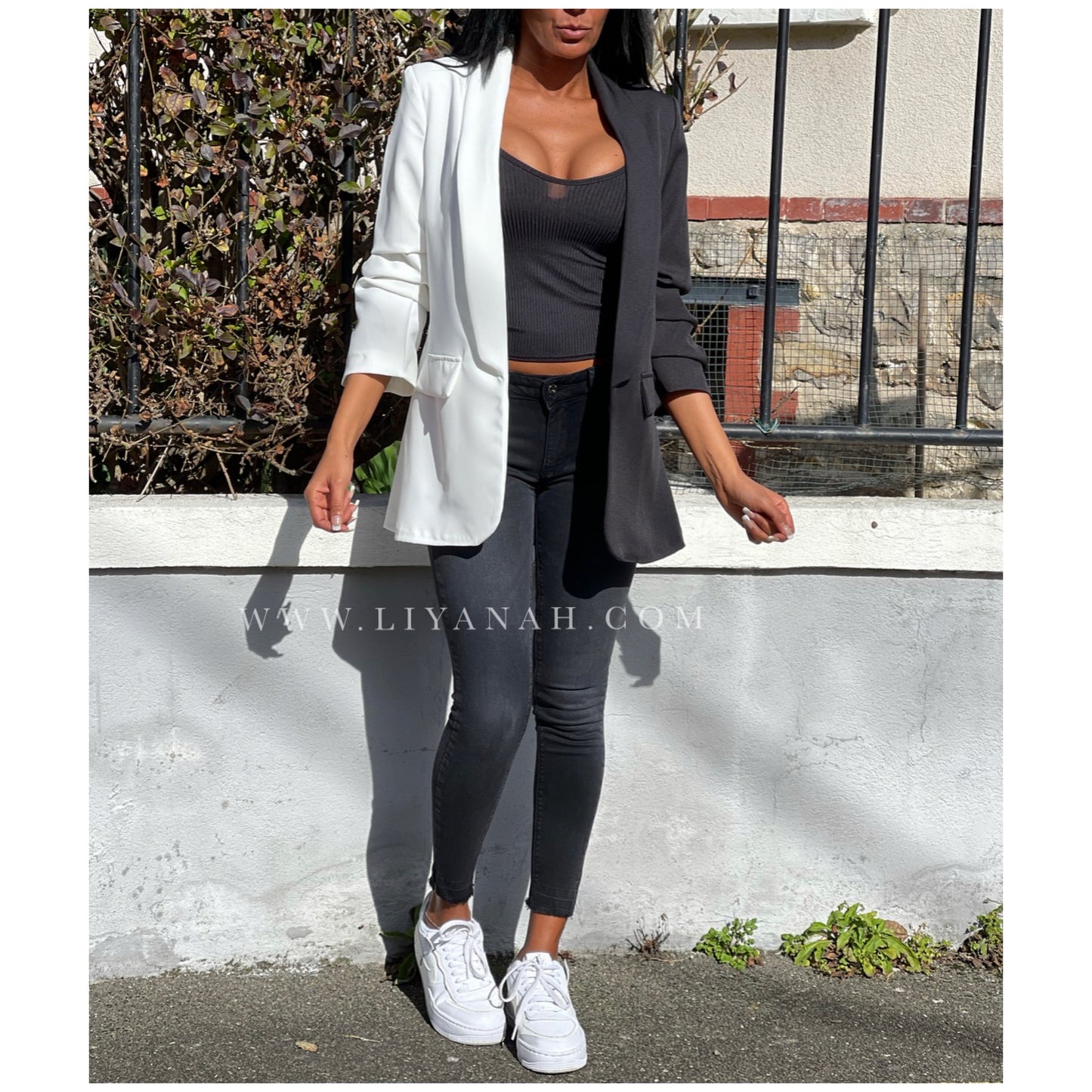 Veste tailleur, modèle léger et fluide, doublure intérieur, épaulettes, manches 3/4 fixes, deux fausses poches - 97% Polyester 3% Elasthanne - Taille S au L - Coupe cintrée